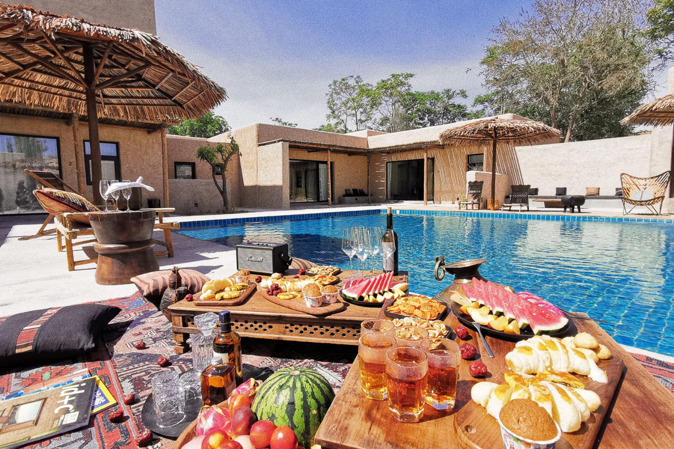 5家民宿各自布局,但也拥有一些共享基础服务,如共享餐厅承担了整个园区早餐的供应;只要住在“黄河宿集”里,可以在所有民宿的公共区域出入和拍照;体验项目也为园区共享,可以通过酒店的管家提前预订(无论预订哪个品牌,都会有管家提前联系),包括沙漠下午茶/258人、沙漠烛光晚餐/680人、以及多种沙漠户外项目;园区的许多地方都栽种了梨花,每年4月左右大片盛开,也成为入住宿集的宝藏体验。
