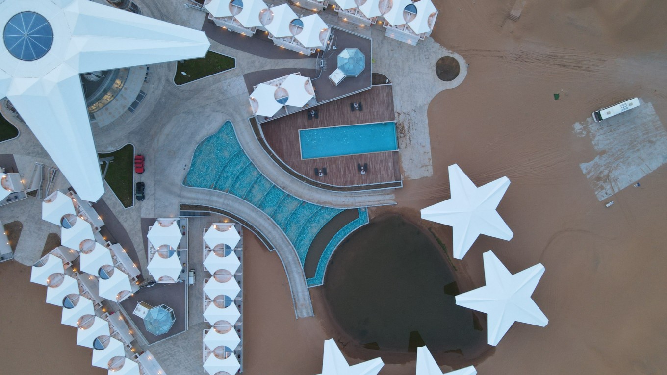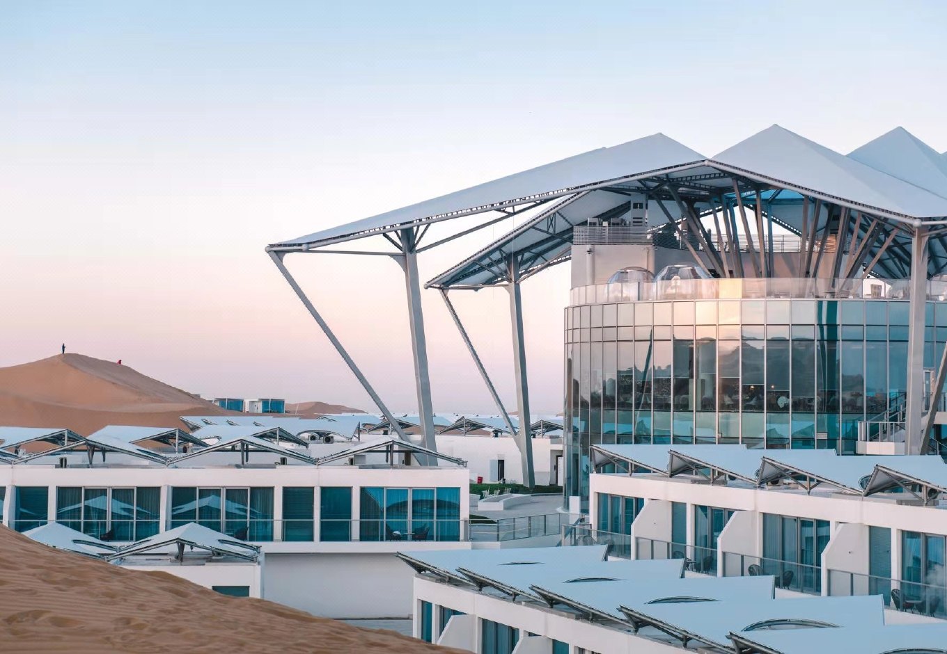 酒店本身就非常出片,在客房门前可以拍出像北非一样小说般的故事感;酒店中的巨大半圆型建筑——星星剧场,在远处看像快要升起的太阳,远远望去如同科幻大片。另外一席难求的湖边晚宴也是入住的热门预订项目,在湖边享用沙漠下午茶或者晚餐,别有一番风情。